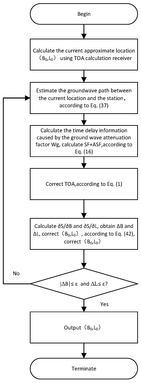 This section mainly completes the correction of the TOA of the Loran-C receiver, i.e., by locating the approximate position, reverse-calculating the ground wave transmission path, calculating the delay TOA caused by ground wave transmission, and correcting d, thereby providing a more accurate distance for pseudorange positioning.