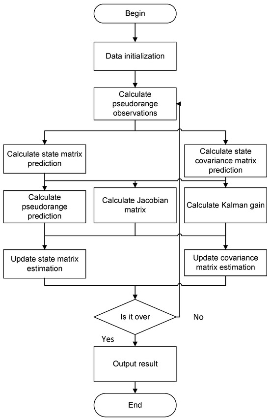 We set the state covariance matrix P, the process noise covariance matrix Q, and the state transfer matrix F; obtain the pseudorange observations of the three stations; and perform the EKF computation of according to Figure 5. After completing the cross-station chain clock difference calculation, the pseudorange localization calculation is carried out according to Section 2.6 to complete the cross-station chain pseudorange localization. The EKF process is shown in Figure 5.