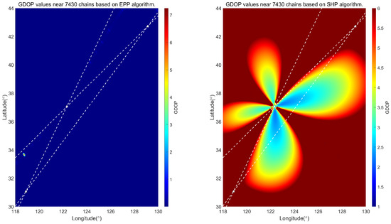 The simulation calculates the positioning results of different station chains of the Loran system, assuming that the bias due to the signal propagation environment is negligible. Specifically, it is believed that the Loran signal consists of only at this time. We select c = 299,792,458 m/s, . We calculate the theoretical GDOP values for each chain. Figure 6 shows a comparison of the GDOP values for the two algorithms for the 7430 chain; Figure 7 shows a comparison of the GDOP values for the two algorithms for the 8930 chain; Figure 8 shows a comparison of the GDOP values for the two algorithms for the 6780 chain. The intersection of the white dashed lines in each figure is the Loran-C navigation station.