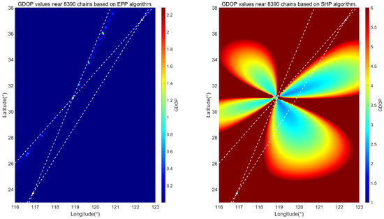 The ellipsoidal pseudorange positioning (EPP) algorithm has been derived in the previous section. The following simulation analyses are conducted to evaluate the positioning performance of this algorithm and the traditional single-station chain spherical hyperbolic positioning (SHP) algorithm. The GDOP [24] values of the two algorithms are calculated separately. Due to the different coverage areas of each chain in China, the positioning results in other regions need to be analyzed. In the following, the GDOP is calculated for the regions near the 7430 station chain, 8390 station chain, and 6780 station chain in China.
