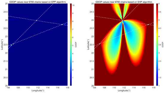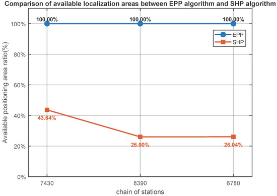 Comparing Figure 6, Figure 7 and Figure 8, it is evident from the GDOP distribution map that the overall GDOP values near each chain when using the EPP algorithm are relatively low, while the GDOP values near each chain when using the SHP algorithm exhibit a star-shaped distribution based on the geometric layout of the chains. We calculate the ratio of the usable positioning areas for the SHP algorithm and the EPP algorithm, taking . The result for the 7430 station chain is 43.64%; for the 8390 station chain, it is 26.00%; and, for the 6780 station chain, it is 26.04%. There are differences depending on the geometric position of the station chain. It can be concluded that the scope of application of the EPP algorithm is significantly greater than that of the SHP algorithm, as shown in Figure 9.