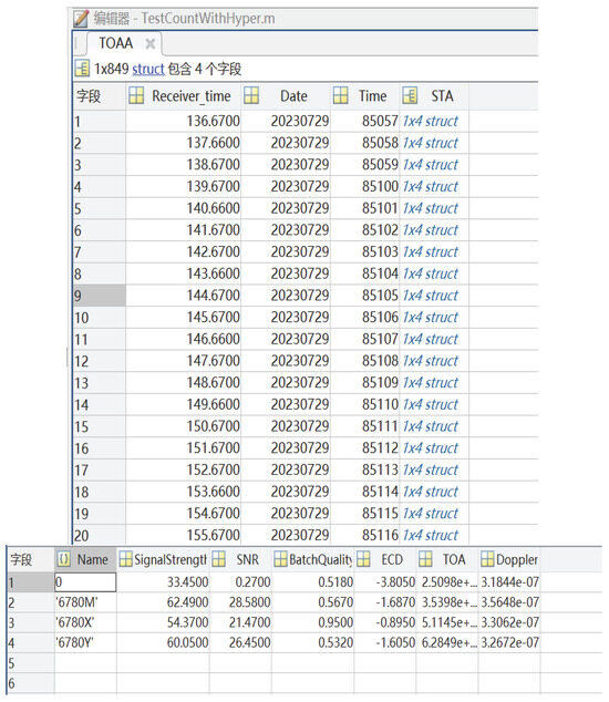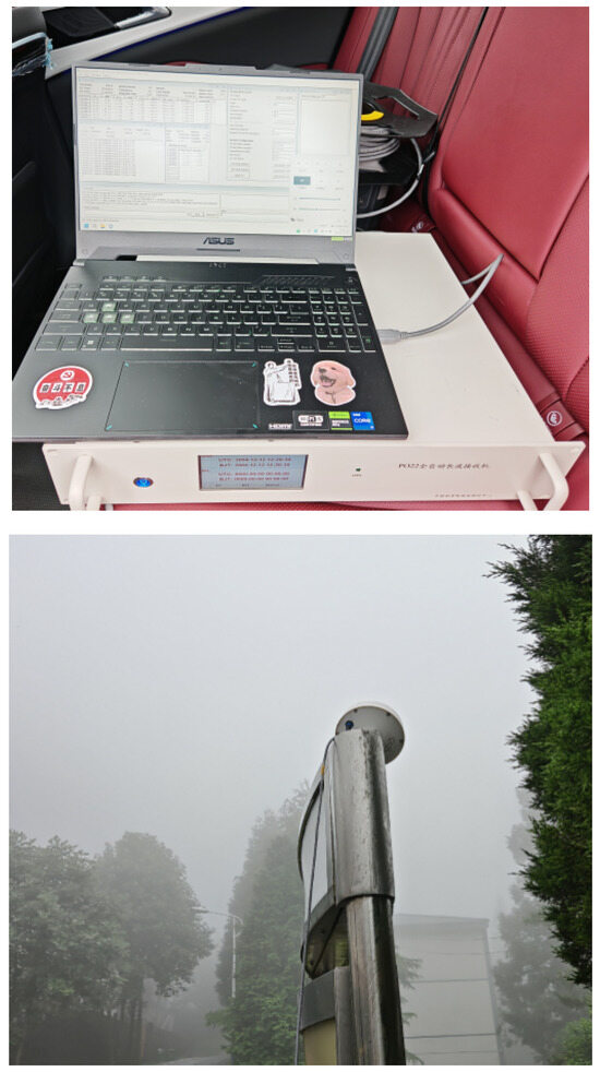 The UN-152B receiver produced by Ursa Navigation Solutions, Inc. was used to receive Loran-C signals and measure the delay information from the receiving point to each station. The built-in delay of the receiver is 72.6 s. UN-152B is a mature Loran-C receiver that is capable of some algorithmic suppression of receiver clock errors and multipath errors. On the day of the experiment, there was light rain. A vehicle-mounted receiver and computer were used, with the antenna placed outdoors in an open area. A total of 100 sets of TOA observation data with signal strength (SNR) greater than 5 dB were selected. Using a MATLAB program, the average positioning results were calculated, and the two methods, EPP and SHP, were used to compute the positioning values. The UN-152B measurement data were grouped, as shown in Figure 11. The UN-15B receiver and antenna are illustrated in Figure 12.
