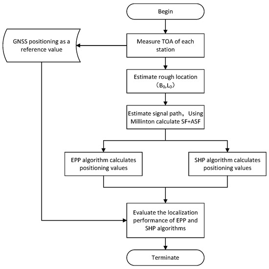 By setting a smaller threshold , when and , the positioning result is output; otherwise, the above calculation process is repeated. The flowchart is shown in Figure 3.