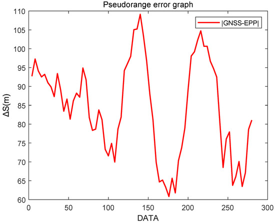 The measured data of Jiugong Mountain in Hubei Province are selected for pseudorange localization calculation, and the GNSS antenna coordinates are N, E. We select the relative dielectric constant and the Earth conductivity , and the measured data are processed by MATLAB, as shown in Figure 4. The data of 6780M, 8390M, and 8390Y are selected for the localization process. The cross-station chain clock difference filtered image is shown in Figure 16. Taking the GNSS localization as the reference value, the EPP localization error is as shown in Figure 17, and the RMSE is calculated to be 78.4 m. Regarding the reason for the increase in error in this experiment, this comprises two aspects. One is the estimation aspect of the cross-station chain time difference, which remains difficult to estimate accurately, even with the EKF. The second reason is that Jiugongshan is very far away from the Loran-C stations, and the average value of the geoelectric parameter is impractical when estimating , which leads to a significant localization bias.