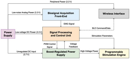 The proposed system is a fully integrated, wearable platform designed to deliver TENS under closed-loop control driven by sEMG signals. As illustrated in Figure 1, the system comprises four primary modules: a biosignal acquisition front-end, a signal processing and control unit, a programmable stimulation engine, and a boost-regulated power supply. These components are implemented on a compact, battery-powered embedded system featuring wireless connectivity and a mobile interface. The overall design prioritizes modularity, scalability, and power efficiency to enable real-time operation in ambulatory environments.