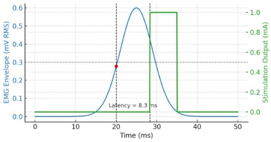 A representative trial is shown in Figure 3, where the top trace represents the EMG envelope and the bottom trace shows the corresponding biphasic stimulation pulse. Two vertical dashed lines indicate the detection point and stimulation onset, with a measured latency of 8.3 ms in this instance.