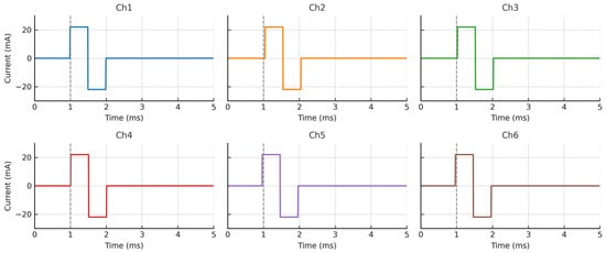 Synchronous biphasic stimulation waveforms from six output channels. Each subplot shows synchronized biphasic pulses recorded under identical resistive loading (10 kΩ). All channels demonstrate consistent amplitude (±22 mA), phase duration (2 ms), and minimal timing jitter. Vertical dashed lines at 1 ms denote trigger onset, confirming simultaneous activation. These results indicate the system’s potential for multi-site, synchronized neuromodulation.