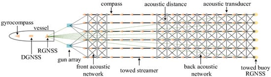 In marine towed streamer seismic exploration, the towed streamer positioning network comprises positioning equipment such as a DGNSS (Differential Global Navigation Satellite System), RGNSS (Relative GNSS), gyrocompass, acoustic transducer, and compass, as shown in Figure 1. The DGNSS provides an absolute position reference for the entire positioning network. After the vessel’s heading is determined by the gyrocompass, the coordinates of any node on the vessel can be calculated. The RGNSS transmits the position reference to the gun array and tail buoy, providing a reference point for the underwater towed streamer positioning. Acoustic observations form an acoustic observation network. Combined with compass and depth observations, this determines the shape and position of the towed streamer [29,30]. Each streamer is equipped with hydrophones spaced approximately 10 m apart to collect seismic wave data. Determining the positioning information of these hydrophone arrays is equivalent to determining the shape of the entire streamer. Thus, the streamer positioning problem is essentially a streamer shape determination.