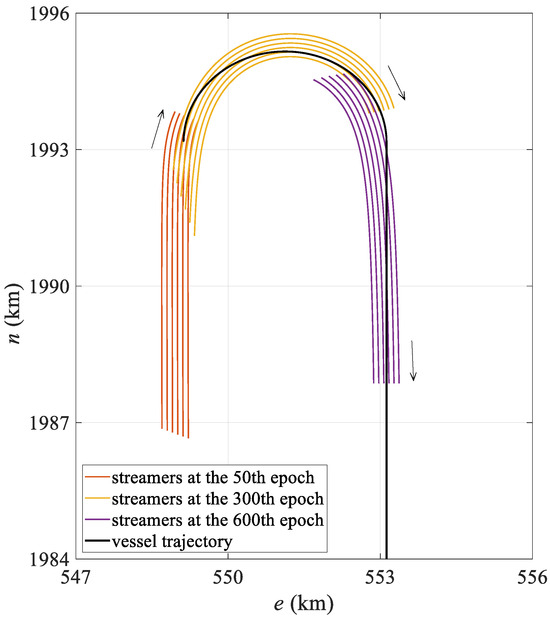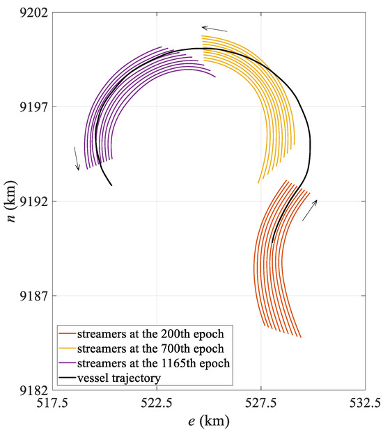 Case II: Vessel trajectory and streamer shape at different epochs.