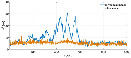 Figure 7 shows the mean positioning deviation of the hydrophone for each observation epoch. It can be seen that the deviation of the two positioning models for the first 200 epochs is approximately uniform, with minimal deviation from the reference value. The positioning deviation of the two models for the last 200 epochs is greater than that for the first 200 epochs, and the positioning accuracy of the spline curve is significantly better than that of the polynomial curve model. After 300 epochs, both models exhibit jumps to different degrees, likely due to variations in observation quality. Both models apply single-epoch calculations and lack temporal continuity constraints.