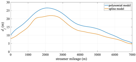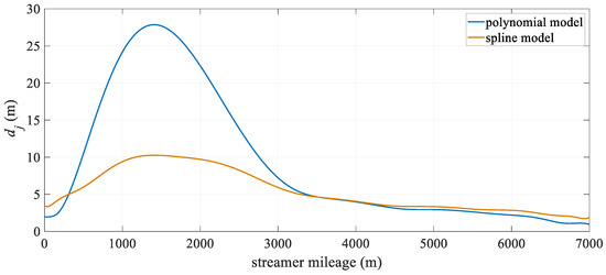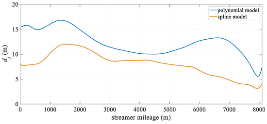 Figure 4 illustrates the change in hydrophone deviation with towed streamer mileage. It is evident that both models exhibit relatively large positioning deviations in the middle section of the towed streamer. This is because the front section of the streamer only has compass observations and lacks acoustic observations. Additionally, the front and rear sections of the streamer have high-precision RGNSS coordinate observations, which results in the front section of the streamer having significantly lower positioning accuracy than the two ends. Overall, the spline model outperforms the polynomial curve model, particularly in the middle-front section of the streamer, where there are no acoustic observations. After 4000 m, the positioning accuracy of the polynomial curve model approaches that of the spline model. This suggests that the spline model can significantly reduce modeling errors in the absence of acoustic observations, while at other mileage sections, its positioning accuracy remains essentially the same as that of the polynomial curve model.