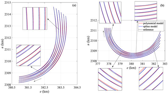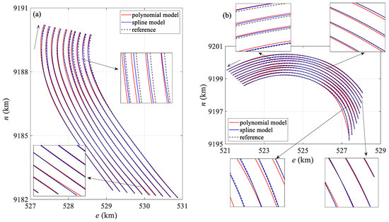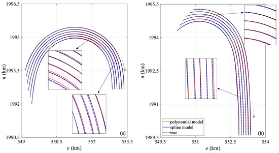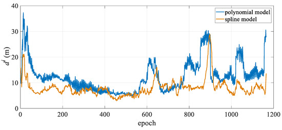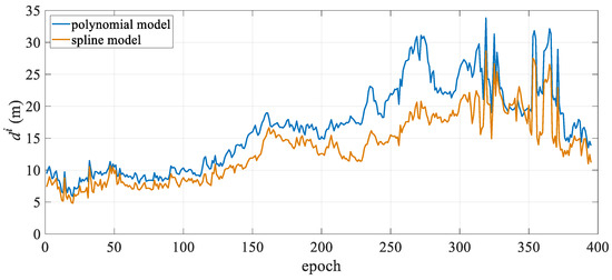 Table 3 shows the mean, standard deviation, maximum, and minimum values of the mean positioning deviation of the two models by epoch. The results indicate that the point error of the spline curve model is 35.0% lower than that of the polynomial curve model, with the maximum value decreasing from 37.30 m to 28.92 m. This demonstrates that the spline curve model provides superior positioning accuracy and stability compared to the polynomial curve model.