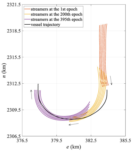 The field measurement data originate from an offshore exploration operation conducted in 2024. According to the actual exploration operation requirements, the vessel is equipped with three DGNSS devices, two gyrocompasses, and one RGNSS reference station to provide position calculation references for the towed streamer positioning network. Meanwhile, the vessel tows 10 streamers, each 8100 m in length, with a spacing of 150 m between adjacent streamers. Each towed streamer is equipped with 648 hydrophones, 39 compasses, 19 acoustic transducers. The hydrophones are spaced 12.5 m apart. The first three compasses are spaced at 75 m and 150 m intervals. The remaining compasses are spaced 300 m apart. The acoustic transducers are configured in a front–rear network configuration. Three acoustic transducers are deployed at the front of the towed streamer, forming a front network acoustic array with the gun array and the acoustic transducer on the head buoy. Sixteen acoustic transducers in the middle and rear sections of the towed streamer, along with the acoustic transducer on the tail buoy, form a rear network acoustic array. As shown in Figure 10, the measured data records the entire process of the towed streamer turning 180°. The turning radius was approximately 3500 m, and the entire turn lasted approximately 3.3 h and comprised a total of 1165 epochs.