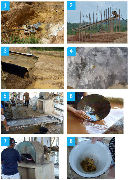Representative scenes from artisanal and small-scale gold mining (ASGM) operations. (1) Mining of gold-bearing soil. (2–3) Washing and gravity separation of placer deposits using water channels and sluice boxes. (4) Gold-bearing quartz rock extracted for further processing. (5) Crushed rock is washed over a mercury-coated copper plate, enabling mercury to capture fine gold particles. (6) Scraping of the mercury–gold amalgam from the plate surface. (7) Heating of the amalgam using a burner to vaporize mercury. (8) Residual sponge gold obtained after vaporization.