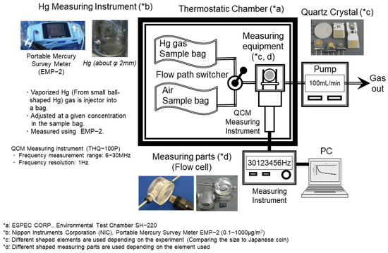 We conducted tests to determine the basic detection mechanism of the QCM-Hg sensor. Figure 2 presents the configuration of a representative experimental setup employed in the present study. In each experimental run, a new gold electrode for the quartz crystal was utilized. To ensure an efficient reaction between mercury in the air and the gold electrode of the QCM, the detection component was capped with a flow cell. Due to the compact size of the detection device, this configuration allowed for precise control over the reaction conditions. To maintain a constant temperature during each experimental run, most components of the experimental apparatus, including the quartz oscillator but excluding the frequency counter, PC, and suction pump, were placed in a thermostatic chamber (SH-220, ESPEC CORP., Osaka, Japan.), as shown in Figure 2. The gaseous mercury (Hg gas) and the QCM surface were both maintained at the same temperature. The Hg gas used in the test was generated by injecting a trace amount of mercury into a vaporization bottle and vaporizing it with a constant flow of carrier gas. The prepared Hg gas was injected into a sample bag, diluted with the reference gas, and then used as the sample gas for testing. Artificial air (N2 + O2) and nitrogen (reference air) were used as reference gases, with no significant difference observed in results between the two. The mercury concentration in the sample gas was measured using a mercury survey meter (EMP-2, Nippon Instruments Corporation, Kyoto, Japan.). This ensured accurate determination of the Hg gas concentration throughout the experiments.