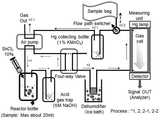 Structure of the Reduction Vaporization–Cold Atomic Absorption Spectrophotometry (Circulating–Open Aeration System). Reprinted with permission from Ref. [23]. Copyright (2021) Institute of Electrical Engineers of Japan.