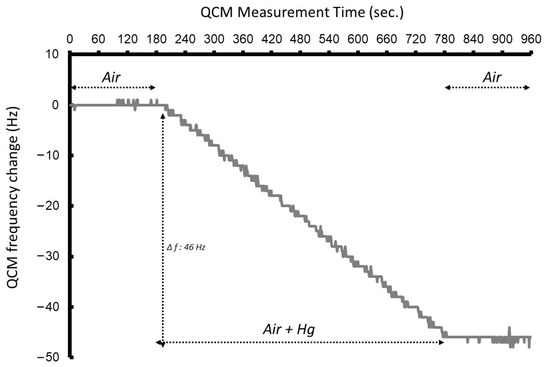 The experiment with the QCM-Hg sensor follows the same process up to the point before switching the four-way stopcock. The key difference occurs after switching the four-way stopcock. After switching, mercury gas is trapped in a sample bag (with a trap volume of approximately 1 L) before passing into the Hg collecting bottle (refer to *2-2 in Figure 3). The mercury gas in the sample bag remains in a vaporized state, meaning it can be detected using a measurement similar to that of the QCM-Hg sensor in the gas phase. It should be noted that this gas cell is not required when measurements are conducted using the QCM-Hg sensor. In this experiment, indoor air was used as the reference gas. For this purpose, a gold adsorption trap tube (manufactured by Nippon Instruments Co., Tokyo, Japan) was employed to remove the extremely small amount of mercury present in the air. The gold adsorption trap tube is capable of adsorbing trace amounts of mercury from the air (typically around several ng/m3) and is recognized as an official method in environmental monitoring [51]. The gas passing through this trap tube served as reference air. In this QCM-Hg sensor experiment, reference air was first flowed through to ensure no frequency shift (confirmation of a stable baseline). The sample bag was then switched to one containing mercury gas, and the frequency shift relative to the mercury concentration was measured. The aim of this experiment was to determine whether the QCM-Hg sensor could measure mercury concentrations at water quality reference levels (0.5 µg/L). A HgCl2 solution prepared at a concentration of 10 ng/mL was used. A 0.5 mL aliquot of this solution, containing 5 ng of mercury, was collected in a reaction bottle, to which approximately 10 mL of pure water was added as sample water. The mercury concentration in this sample water corresponds to the Japanese water quality standard concentration of 0.0005 mg/L (0.5 µg/L). Next, approximately 1 mL of a 10% SnCl2 solution was added to the reaction to facilitate reduction and vaporization. Assuming complete vaporization of the mercury, the mercury gas was collected in a sample bag (1 L), which corresponds to a gaseous mercury concentration of approximately 5 µg/m3.