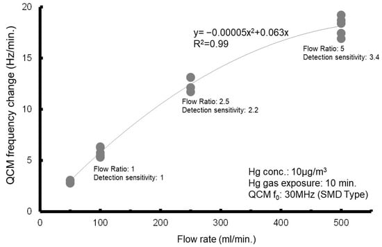 Specifically, using a quartz crystal element with a fundamental frequency of 30 MHz, and under experimental conditions of a flow rate of 100 mL/min and a measurement duration of 10 min, an approximation equation (Equation (3)) was derived based on the frequency shifts corresponding to each mercury concentration. Applying this equation, a mercury concentration of 1 µg/m3 yields a frequency shift of approximately 5 Hz after 10 min of measurement. Furthermore, as shown in Figure 7, the experimental results indicate that the frequency shift increases with higher flow rates.
