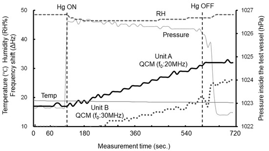 Based on this approximation equation and the experimental findings, it was demonstrated that the QCM-Hg sensor can detect mercury at concentrations as low as approximately 1 µg/m3—a level that has previously only been achievable with commercially available analytical instruments. Moreover, detection of mercury concentrations below 1 µg/m3 is also considered feasible.