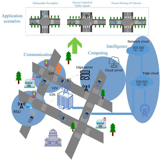 In the previous research process of 6G, the development process of sensing, communication, computing, and intelligence was carried out independently. However, with the demand of the 6G concept for capacity, delay, accuracy, computing power, and other indicators, the enhancement of these technologies alone cannot directly bring about the improvement of system indicators and restrict the development of business forms. Therefore, the cross-fusion of 6G functional modules has become an inevitable research trend [13]. The ISCCI can not only meet 6G’s requirements, such as extremely low delay, extremely high energy efficiency, and large capacity, but also promote mutual enhancement of each module. The ISCCI will be an important component of the 6G system and the starting point for system empowerment and efficiency. The concept of ISCCI is the integration of various technologies in each node of the mobile system, unified coordination, and utilization of ISCCI-related resource information, which is a grand concept and system project. The deep combination of information communication technology and sensing technology has led to the ISCCI being a key strategy for enhancing the capability of intelligent systems [14]. In cutting-edge fields such as smart cities, autonomous vehicles, drones, and intelligent manufacturing, more stringent requirements are put forward for the level of intelligence and immediate response ability of the system. The rising demand for data processing in complex environments, along with the decreasing efficiency of traditional communication and data processing methods in the context of massive data and rapidly changing conditions, drove us to explore new solutions in this paper. The organic ISCCI functions can not only give full play to the advantages of various technologies but also promote the rapid development of various intelligent applications. In addition, the integrated architectures facilitate more efficient data transfer, real-time feedback, and intelligent decision-making, thereby substantially enhancing overall system performance. In the IoV system, the architecture of the ISCCI plays a crucial role. By consolidating these functions, the architecture enables intelligent interactions at the levels of vehicle-to-vehicle (V2V), vehicle-to-infrastructure (V2I), vehicle-to-pedestrians (V2P), and vehicle-to-network (V2N).