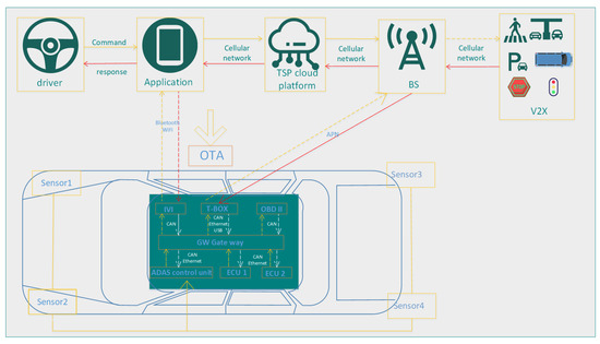Figure 4 illustrates the architecture of an IoV system, which can be analyzed from four aspects: the physical layer, network layer, application layer, and system layer. In the figure, the physical layer consists of various sensors that are responsible for collecting the vehicle’s physical state and transmitting this information to the vehicle control unit. The network layer utilizes the controller area network (CAN) for data exchange between electronic control units, facilitating communication within the vehicle. The telematics unit (T-BOX) communicates with the external transportation service provider (TSP) cloud platform through the cellular network to enable remote data exchange and control. The gateway (GW) acts as a bridge between the vehicle’s internal and external networks, managing the flow of data and converting communication protocols. Application layer: Through the real-time navigation system of multi-source data fusion and dynamic path planning, the car infotainment system of multimedia content distribution and individualized service, and the status of the real-time monitoring and remote vehicle monitoring platform security early warning, three core function modules implement the intelligent vehicle service. This layer encompasses various in-vehicle application services delivered through in-vehicle infotainment systems (IVI) and T-boxes, as well as over-the-air (OTA) downloads for remotely updating vehicle software and hardware. The IoV system architecture consists of a multi-level system including the driver layer, application layer, TSP cloud platform layer, base station layer, and V2X communication layer. Among these, the driver interacts with the vehicle control system through instruction input, while each application module provides functional services to users through the human–machine interaction interface. The TSP cloud platform serves as a central processing and data storage center that is in charge of collecting, analyzing, and processing data from vehicles, as well as delivering corresponding services. The base station is an integral part of the cellular network, facilitating communication with the T-BOX to ensure seamless data transmission between the vehicle and the cloud platform. V2X communication includes V2V, V2I, V2P, and V2N to achieve comprehensive interconnection of vehicle networking.