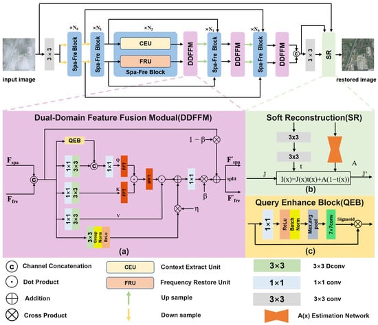 In recent years, Transformer models have demonstrated strong capabilities in modeling long-range dependencies and capturing global context, leading to notable improvements in image dehazing performance. For instance, DehazeFormer [18] leverages a Swin Transformer backbone with an enhanced window attention mechanism to capture spatial context. AIDTransformer [36] incorporates deformable multi-head attention and spatial attention offset modules, combined with edge-enhanced skip connections, to focus on relevant contextual information while preserving texture and edge details. PCSformer [37] introduces sliding cross-shaped stripes and local–global proxy Transformer blocks to strengthen contextual interactions. Additionally, some approaches have explored the joint utilization of spatial and frequency domain features for dehazing. FOTformer [22] employs frequency-aware attention and content reconstruction networks in the frequency domain, effectively integrating spatial and frequency features to improve the recovery of complex textures and structures. SFAN [23] utilizes hybrid expert modulation and frequency decoupling learning to dynamically adapt to multi-scale features, efficiently handling frequency domain information.