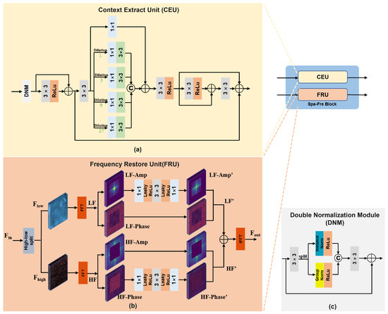 The Spa-Fre Block is one of the core functional components of DFFNet. It consists of two parallel branches, the spatial domain unit (CEU) and the frequency domain unit (FRU) as illustrated in Figure 2a and Figure 2b, respectively. This parallel design facilitates the independent processing of spatial and frequency features within the same layer, thereby reducing interference caused by serial computation. The detailed workflow of the Spa-Fre Block is as follows.