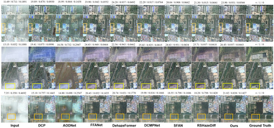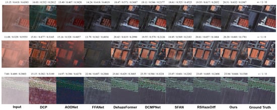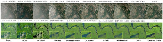 With the rapid advancement of remote sensing technology, remote sensing images have been widely applied in numerous fields such as civil engineering, forestry resource surveys, and geological exploration [1,2,3,4,5]. However, these images are frequently degraded by environmental factors such as atmospheric scattering and cloud, leading to issues such as excessive whitening, reduced contrast, and obscured content [6]. Such degradations severely undermine the utility of remote sensing images in downstream tasks. Consequently, image dehazing has become an essential preprocessing step to enhance the quality and reliability of remote sensing applications.