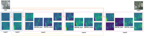 In this subsection, a representative remote sensing image characterized by non-uniform haze distribution is selected as an input example, where the bottom-left region is heavily obscured by dense haze, while the remaining areas are relatively clear or haze-free. Figure 7 illustrates how the input is progressively processed across different layers of the network. Frequency domain and spatial domain feature maps are highlighted with orange and yellow borders, respectively. Layers 3 to 5 illustrate the feature representations before and after DDFFM fusion. From left to right, the columns correspond to input features from the frequency and spatial branches, concatenated dual-domain features, fused outputs after DDFFM processing, and separately recovered frequency domain and spatial domain outputs obtained via channel-wise decomposition.