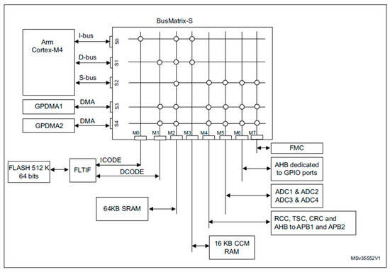The real-time performance of the proposed digital twin is enabled by the internal architecture of the STM32F303RET6 microcontroller, which integrates a high-speed Arm Cortex-M4 core with an advanced bus matrix and dual DMA controllers. Figure 1 illustrates a multi-layer AHB bus matrix that interconnects peripherals, memory blocks, and system buses, enabling high-throughput, low-latency communication throughout the system.