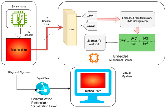 As can be seen in Table 1, the proposed embedded implementation offers a compact and physically interpretable solution for real-time thermal field reconstruction, standing in contrast to the more specialized and resource-intensive approaches in [12,13]. While [12] employs a high-performance SRAM-based process-in-memory accelerator to solve the 2D Poisson equation using multigrid residual methods, it requires custom silicon and is optimized for desktop-class scientific computing. In contrast, Ref. [13] realizes a nonlinear shock tube PDE solver using analog CMOS hardware, achieving high analog bandwidth but at the cost of high-power consumption (936 mW) and limited programmability. The proposed work solves the 2D Laplace equation using a physics-informed digital twin implemented on a low-cost STM32 microcontroller, integrating real-time sensing, computing, and communication under 100 mW of power. Unlike [12,13], which are fixed to their respective problem classes and hardware substrates, the proposed solution is fully programmable, modular, and adaptable to a range of physical systems governed by elliptic PDEs. The design enables physically consistent monitoring without the need for external computing resources or analog calibration, making it highly suitable for educational, prototyping, and diagnostic applications at the edge.