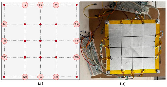 (a) Schematic diagram of thermal field reconstruction using a 5 × 5 mesh: red dots represent estimated interior temperatures, and circled values correspond to boundary temperatures measured by thermistors; (b) Physical setup displaying the actual sensor deployment on the metallic plate.