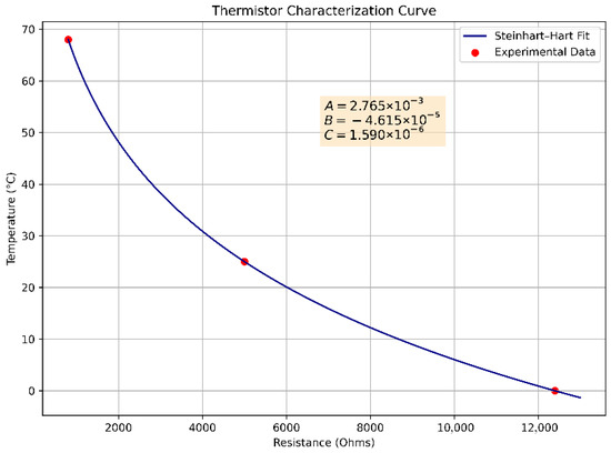 It is necessary to apply thermal boundary conditions to address heat distribution challenges, particularly in embedded systems where Laplace’s equation serves as a specific steady-state model. Thermistors are a popular choice for temperature sensors at boundaries due to their small size and high sensitivity. In embedded PDE applications, thermistor measurements can be utilized to set Dirichlet boundary values for fixed temperatures or Neumann conditions at the edges of a simulated domain [16]. However, raw thermistor signals are highly nonlinear with respect to temperature due to the semiconductor nature of the material from which the thermistor is made. The Steinhart–Hart method is a widely used empirical model for converting thermistor resistance into an accurate temperature reading [17]. This model expresses the temperature as a cubic polynomial as