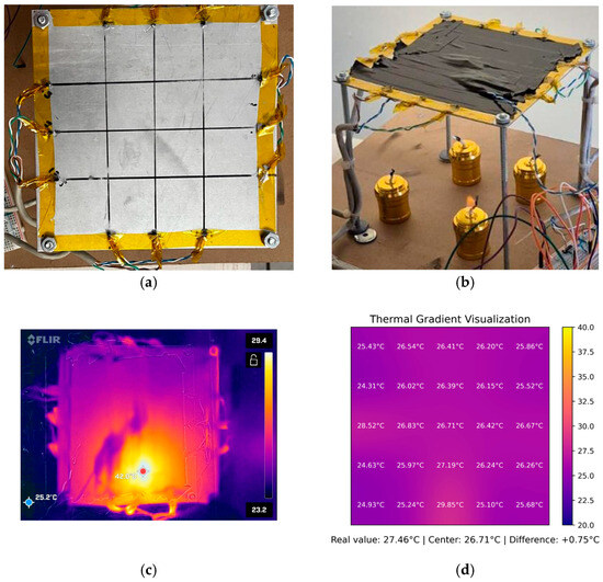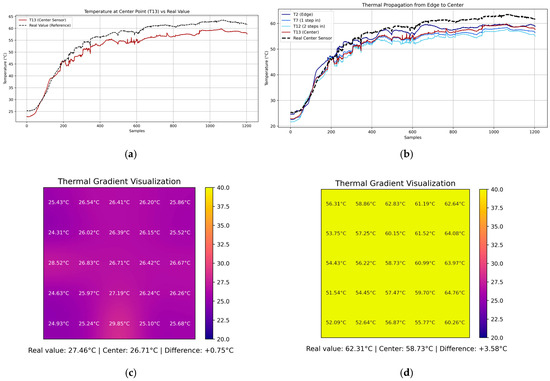 In this experiment, the thermal evolution at the center of the plate was analyzed by tracking both the estimated temperature value computed from the boundary conditions (Figure 9a) and the physically measured value acquired through an embedded thermistor located at the geometric center of the plate. Both values were monitored continuously over a ten-minute interval, with uniform sampling assumed across the duration. Two snapshots were taken from the digital twin output to visualize the thermal performance, which are shown in Figure 9c,d.
