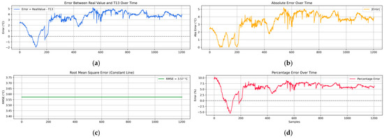 Error metrics between the estimated center temperature computed by the embedded digital twin and the physically measured reference sensor during the symmetrical heating experiment. (a) Time-resolved error between the reconstructed and real temperature at the center. (b) Absolute error magnitude over time. (c) Constant Root Mean Square Error (RMSE) line across the experiment duration (RMSE = 3.57 °C). (d) Percentage error evolution relative to the ground-truth measurement.