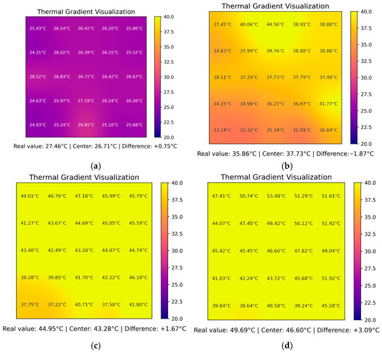 Moreover, the experiment was deliberately conducted in a real laboratory environment subject to uncontrolled disturbances, such as external airflow from opened doors and exposure to air conditioning currents. These perturbations were intentionally preserved during the trials to evaluate the model’s robustness under non-ideal conditions, as typically encountered in industrial environments. While more accurate results could be obtained under strictly controlled thermal conditions, the current findings highlight the resilience of the embedded model in the presence of realistic environmental noise. This characteristic is essential for practical deployment, where such fluctuations are unavoidable. The ability to accurately reflect thermal propagation and gradient formation under such disturbances further demonstrates the robustness and applicability of the proposed system in real-world settings. The thermal gradients corresponding to the beginning and the end of the 10 min test are displayed by the digital twin and are shown in Figure 6c,d.