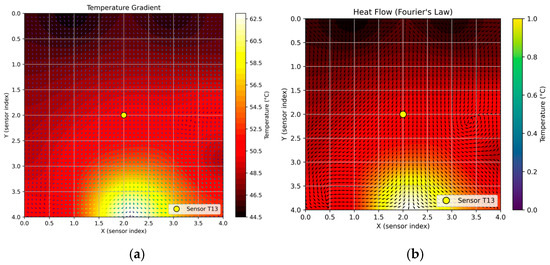 Vector field representation under asymmetric edge heating. (a) Temperature gradient vectors point toward regions of higher temperature. (b) Heat flow vectors obtained from the negative temperature gradient, illustrating energy propagation from hot to cold zones. The central sensor T13 is highlighted in yellow in both plots.