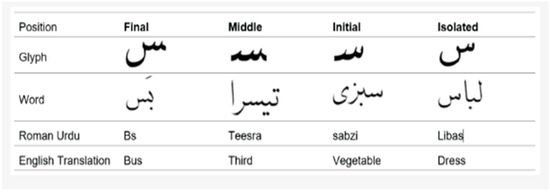 In this study of bilingual NSIs, one of the languages analyzed is Urdu, which is a complex language because it is written in cursive [11]. Multiple forms of the same character in Urdu must be differentiated from one another [12]. Each character takes a different shape depending on its position in a word. Figure 1 shows that when “Seen” is written at the end of the words “Libas” and “Bs,” it takes a particular shape. However, when it is written at the beginning and center of the words “Sabzi” and “Teesra,” respectively, it takes different shapes [12].