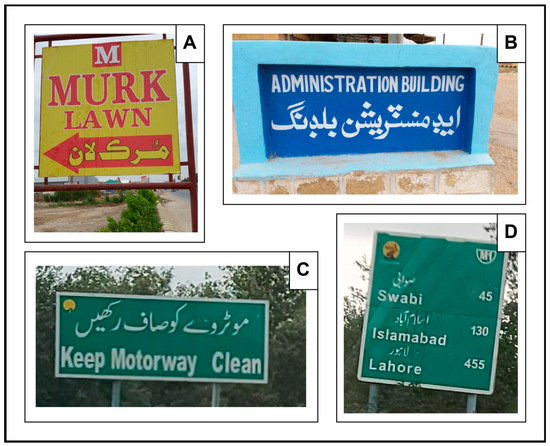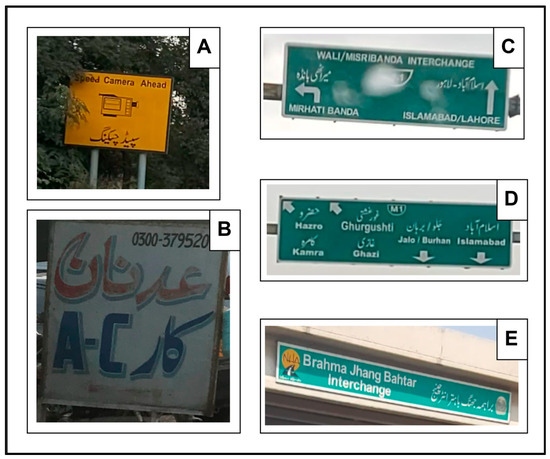 English is another language used in bilingual NSIs and is different from Urdu. It is written with a left-to-right orientation [14] contrary to Urdu with a right-to-left orientation [15], as shown in Figure 3. In addition, English is a non-cursive language [16], while Urdu is a cursive language, i.e., Urdu characters in a word are interconnected [17], whereas English characters are not [18]. For example, Figure 3 image “B” shows character connectivity in syllables of the Urdu word “administration”, that is “ad” “ministr” “ation”. Another example in Figure 3 image “A” shows character connectivity in the whole Urdu words “Speed” and “Checking”. In contrast, the characters in the English words and syllables are not interconnected. Thus, differentiating between English and Urdu in NSIs becomes challenging.