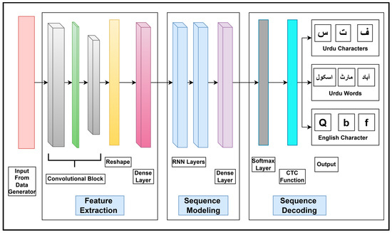 Recent studies [22,23,24] performed Urdu character recognition using HOG, CNN, and MLFF, achieving recognition rates of 73.0%, 88.6%, and 93.0%, respectively. CRNN was also used for experiments on Urdu character and word recognition, achieving a 95.7% CRR and an 87.1% WRR, respectively [25].