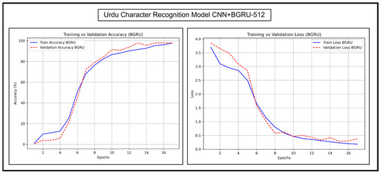 As shown in Figure 17, the training accuracy curve of CNN+BGRU-512 rapidly rose in the early epochs. The validation accuracy curve followed the same trend; however, the validation accuracy was slightly lower in the early epochs and slightly higher in later epochs. Both curves converged slowly, showing that the model stabilized, and its performance did not change much in later epochs. The training loss of CNN+BGRU-512 declined sharply in the initial epochs due to fast convergence. The validation loss was slightly higher than the training loss. It slightly decreased at epoch number 5 and suddenly increased at epoch number 6, but quickly stabilized with the training curve. Both loss curves quickly converged at later epochs, showing a stabilized learning phase.