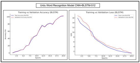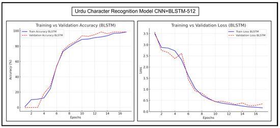 Figure 18 shows that the training and validation accuracy curves of CNN+BLSTM-512 increase steadily in the upward direction. The validation accuracy curve is slightly higher than the training curve throughout the epochs, indicating the strong generalization of the model. The accuracy levels are relatively lower than CNN+BGRU-512 in the initial epochs but improve consistently, resulting in better generalization. CNN+BLSTM-512 also shows smooth training and validation loss curves, indicating its strong generalization. The validation loss curve is slightly higher than the training curve but in parallel to the training curve. Overall, both models perform well, but BLSTM exhibits a more stable and gradual learning process, with a stronger generalization and better results.