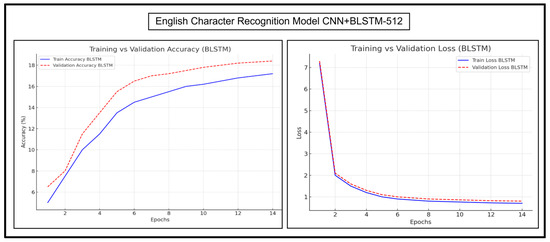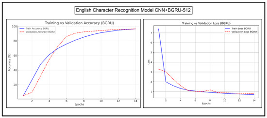 Accuracy and loss trends of CNN+BGRU-512 during English character recognition.