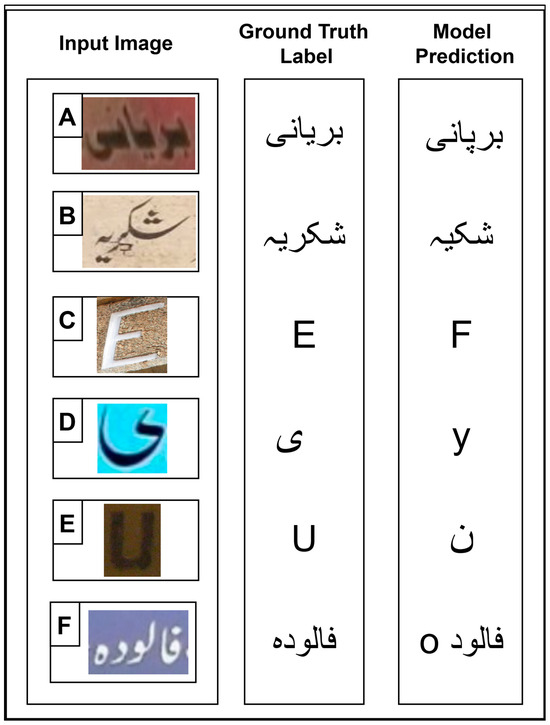 As shown in Figure 19 image “A”, a misclassification occurred due to visually similar Urdu characters. The ground truth label was “Biryani”, while the model incorrectly predicted “Birpani”, replacing “Paay” with “Yaay”. These characters share similar ligatures, differing only by the placement of dots, which can be challenging for models to distinguish, especially in cases where the dots are faint or blended with the background. Moreover, Figure 19 image “B” depicts an error caused by nontext objects. The ground truth label was “Shukriya”, but the model predicted “Shukiya”, failing to recognize the “Raay” character. A faint mark near the “Raay” may have contributed to its omission. This type of issue typically arises in noisy NSIs, due to artifacts like smudges, overlays, and camera noise. In Figure 19 image “C”, the effect of low-resolution input is observed. The ground truth label was “E”, yet the model incorrectly predicted it as “F”. Such errors are common, especially when character boundaries are not clear due to blurring, motion, or orientation. Characters with similar shapes, such as “E” and “F”, become indistinguishable under these conditions.