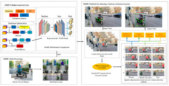The ETOD model, trained on a custom-built electric tricycle dataset, is employed in this study. Subsequently, a multi-object tracking algorithm was integrated to create the ETVDS, enabling functionalities including electric tricycle recognition, trajectory tracking, and detecting passengers. A detailed schematic of the ETVDS is presented in Figure 2.