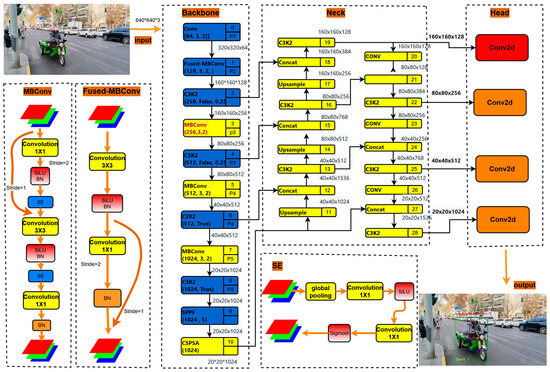 Electric tricycles, valued for their compact dimensions and maneuverability, are nevertheless prone to occlusions in intricate urban traffic environments, thus requiring high-performance object detection. To meet these demands for electric tricycle detection in complex scenes, we optimized the model by integrating a dedicated small object detection head to improve detection accuracy. Moreover, the adoption of EfficientNet as the backbone further enhances the model’s detection efficiency and accuracy. A schematic representation of the model architecture is provided in Figure 3.
