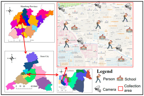 This study’s data collection focused on Lixia District, Jinan City, which is geographically bounded by Jingshi Road to the north, Qingnian East Road and Luowen Road to the west, Shunhe Elevated Road to the east, and Luoyuan Street to the south. This specific area was prioritized for data acquisition due to its demographic characteristics, notably encompassing three schools and exhibiting a high population density. Such attributes contribute to a pronounced use of electric tricycles for child transport, rendering this region highly representative for our research objectives. A more comprehensive visualization of this critical data collection area is provided in Figure 4.