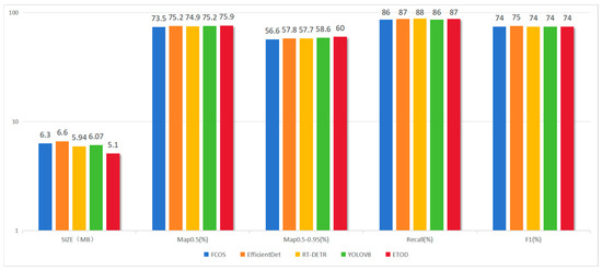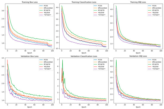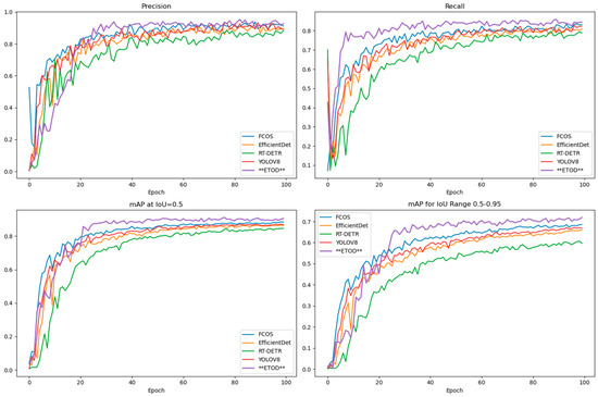 Although the accuracy of individual models exhibits some fluctuation, the overall trend indicates a gradual improvement in the ability to recognize vehicles. The recall rate, while variable, also generally trends upward, suggesting an enhanced capability to consistently detect targets. Notably, the mean average precision (mAP) at IoU thresholds of 0.50 (mAP@50) and 0.50–0.95 (mAP@50–95) demonstrates significant improvement throughout the training duration, confirming a substantial increase in both the accuracy and reliability of the models. The ETOD model exhibits a greater initial rate of improvement compared to the other models, although its rate diminishes in later stages, converging towards the performance levels of the others. However, as evidenced by the metrics presented in Figure 9 the overall performance of the ETOD model remains significantly superior. This superior performance, combined with its faster initial training gains, justifies the selection of the ETOD model for electric tricycle object detection in this research.