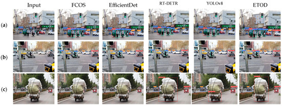 Motivated by practical application needs, this paper conducts detection experiments in three representative scenarios, with results presented in Figure 10. The comparison of detection results between the ETOD model and other algorithms reveals that ETOD achieves more accurate object recognition of irregular electric tricycles. In complex occlusion scenarios, ETOD also exhibits higher detection accuracy. Notably, in load-carrying scenarios, the detection performance of ETOD significantly surpasses that of comparative methods such as FCOS, EfficientDet, and RT-DETR. These results demonstrate the superior performance of the proposed ETOD model for electric tricycle detection, particularly exhibiting increased robustness and reliability in challenging real-world conditions.