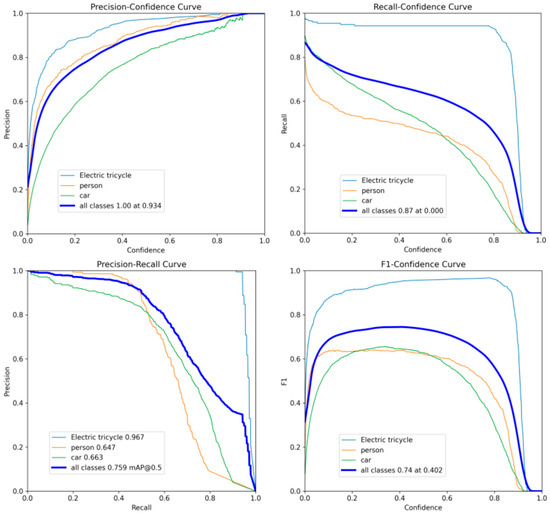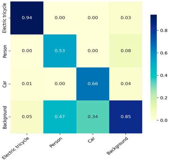 The model’s precision was assessed through a confusion matrix. The precision for electric tricycles reaches 0.94, indicating that 94% of instances in this category are accurately identified, with only 6% being false positives classified as background. In contrast, the precision for pedestrians and cars is only 53% and 66%, respectively. This is primarily due to the lower accuracy of the COCO dataset for these other models [49]. Overall, the model demonstrates good precision.As shown in Figure 11.
